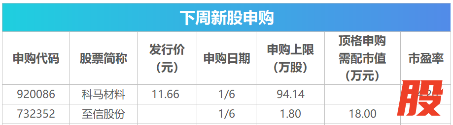 Wind数据显示,下周(1月5日~1月9日)将有2只新股发行,分别为沪市主板的至信股份、北交所的科马材料。