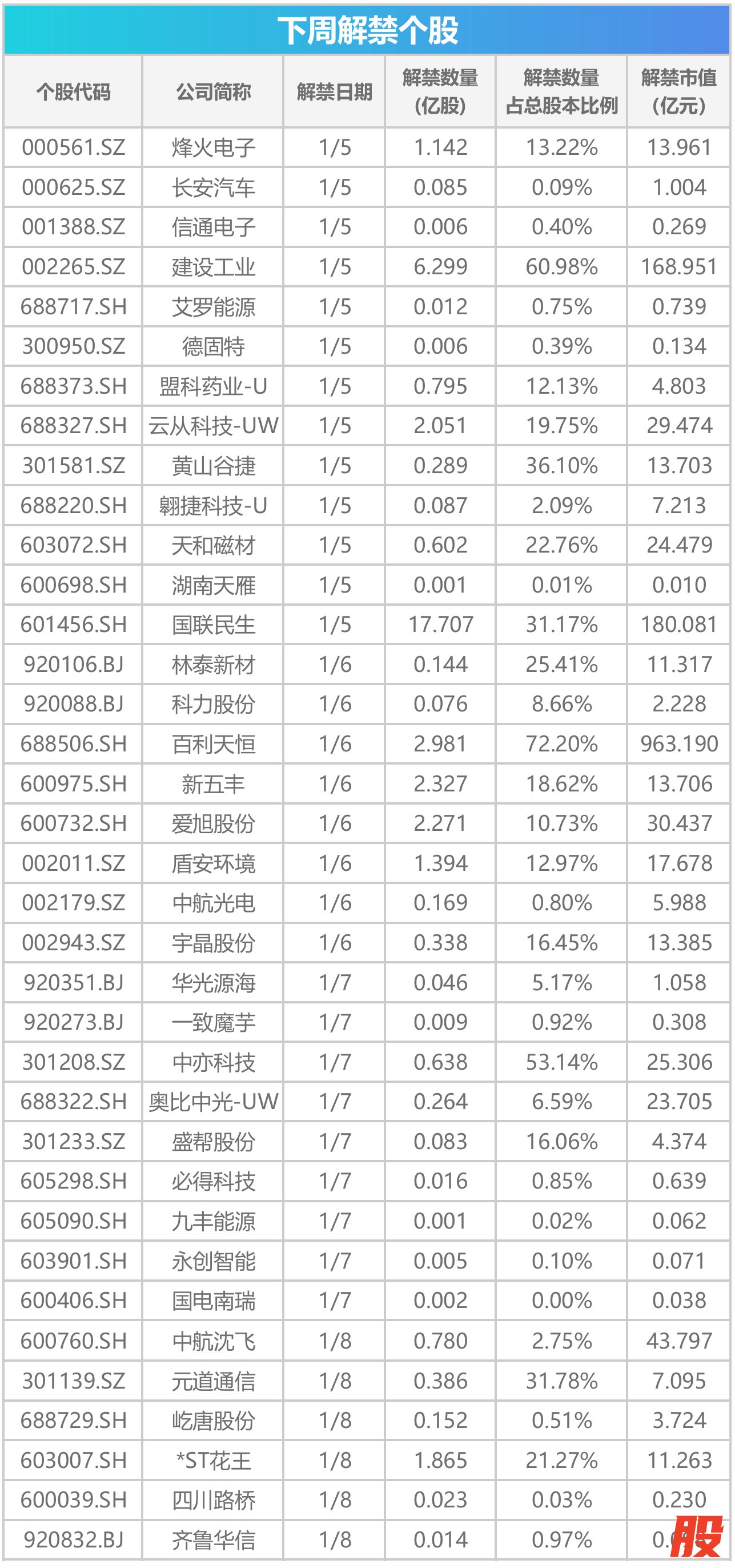 Wind数据统计显示,下周(1月5日至1月9日)共有36只限售股解禁,按最新收盘价计算,解禁总市值超1600亿元。