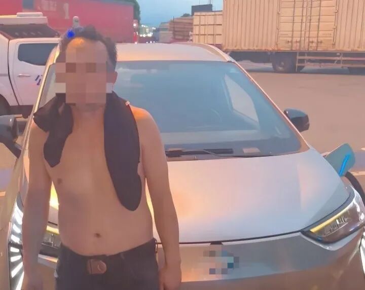 杭州高速交警供图据了解,司机为一男子刘某,警力找到他时,对方正在服务区寻找充电桩。此时的刘某,光着膀子,满头大汗,他说自己开的是一辆新能源汽车,结果电量不足,他只好下车推行。