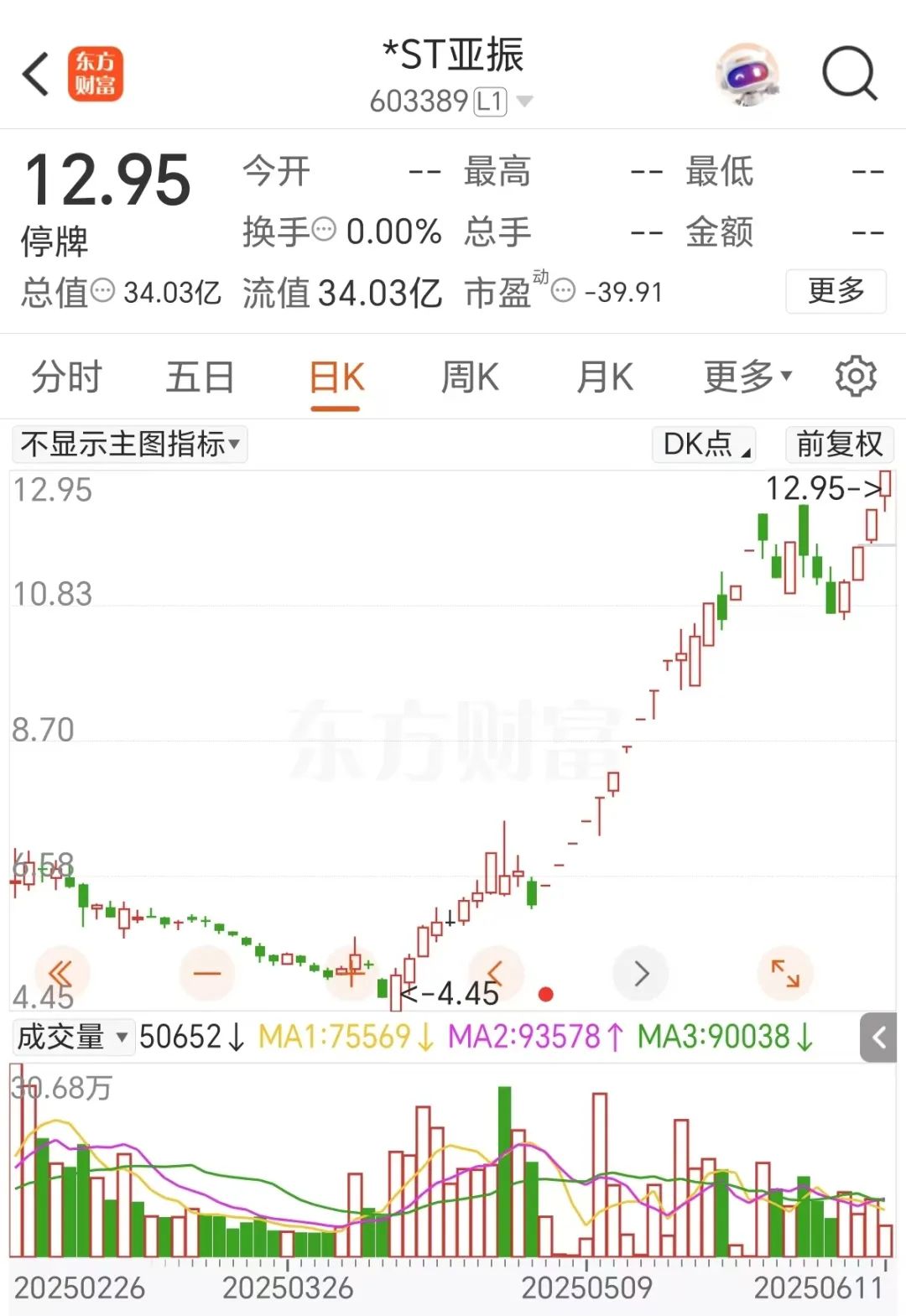 不过令人诧异的是,被实施了退市风险警示后,*ST亚振的股价却连续上行走高,二级市场方面,2025年5月6日至6月11日,*ST亚振走出了了26天16板的走势,股价涨幅超出100%。而同期上证指数仅上涨3.76%,家具制造业指数涨幅仅为4.59%。