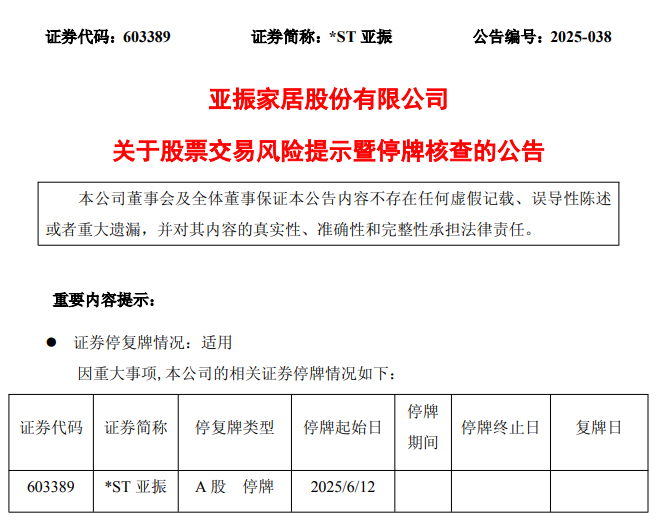 此前因2024年扣除非经常性损益后的净利润为负值,且扣除与主营业务无关的业务收入和不具备商业实质的收入后的营业收入低于3亿元,今年5月6日,亚振家居被实施退市风险警示,股票简称也变更为“*ST亚振”。